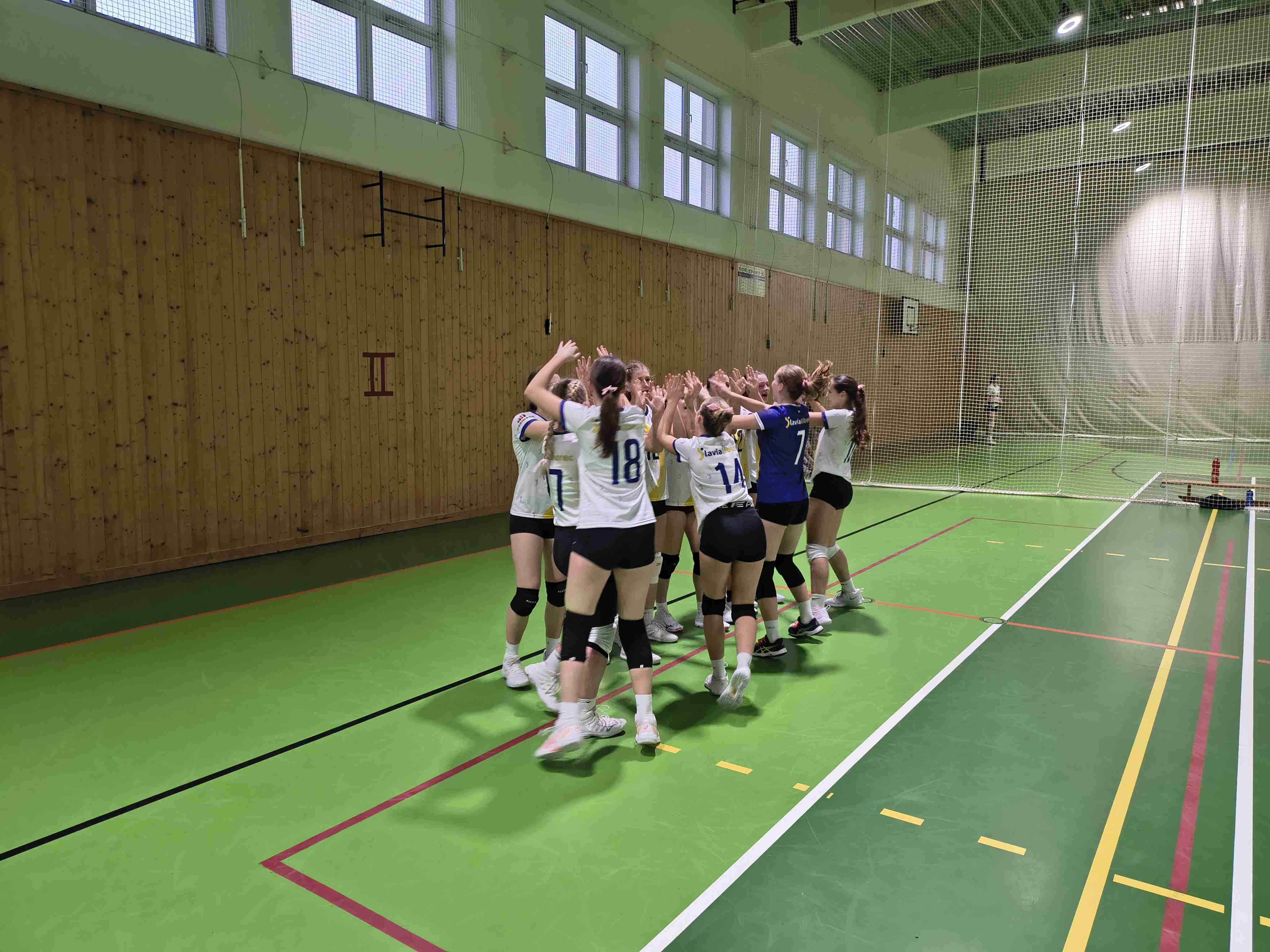 Sobotní herní den dívky odehrály v bílých dresech a vypadalo to že nám nosí štěstí. První zápas s SK Meteor Praha jsme odehráli v celkové pohodě kdy naše slabiny v prvním setu se uházaly jako klíčové ale pílí a radostí ze hry se dívky ujaly vedení a dotáhly první set do stavu 25:22. Druhý set bohužel se nesl v nervozitě soupeře, kterému se zranila hráčka a s výronem odjela na místní pohotovost. Druhý set jsme v klidu dohráli do stavu 25:15. Takže hurá 1 vyhraný sobotní zápas.